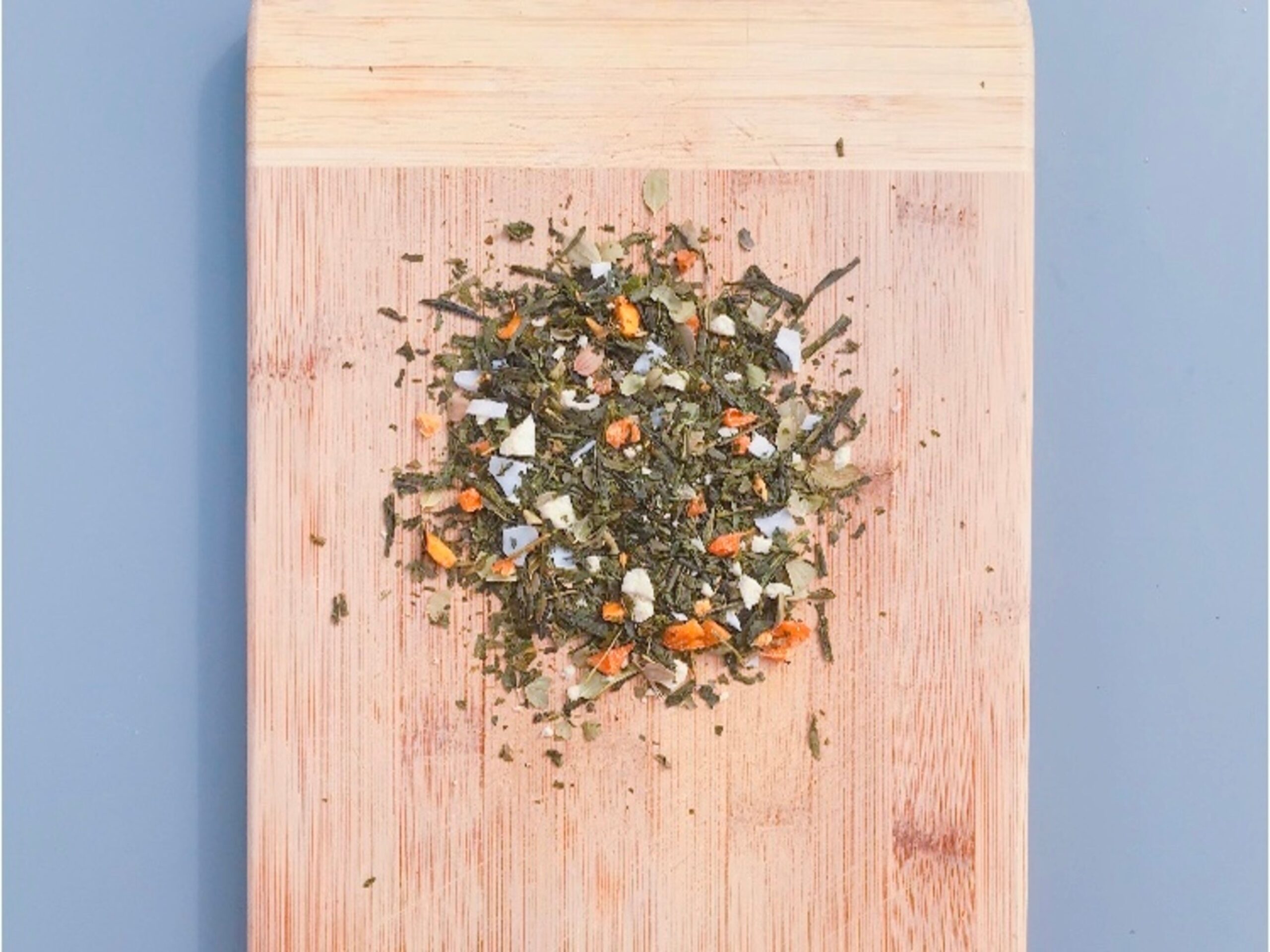 Thé vert bancha au goût délicat, mélangé avec des feuilles de jujubier, des morceaux de coco*, et de mangue**, extraits naturels.